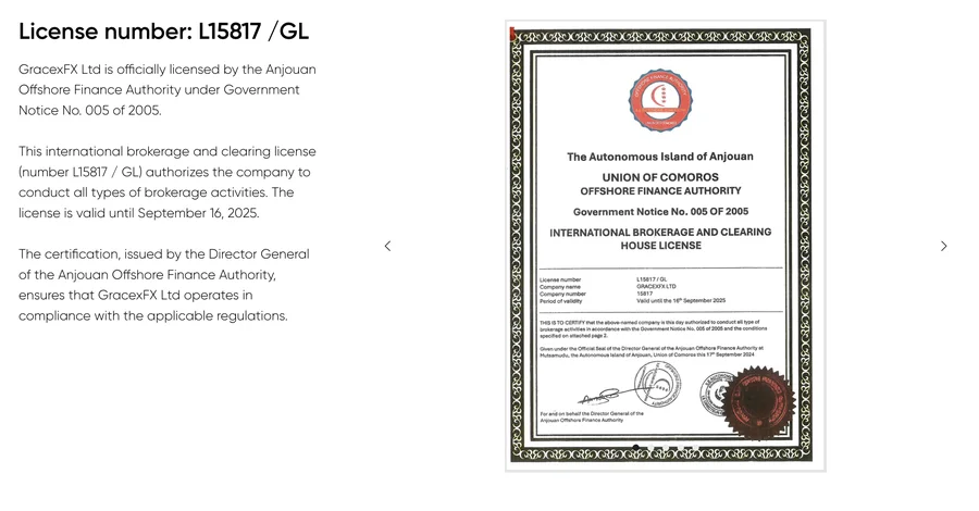 Gracexfx зарегистрирован в юрисдикции Union of Comoros (Anjouan) и имеет лицензию L15817/GL. Регламент обязывает компанию хранить клиентские депозиты на сегрегированных счетах, что защищает их от использования в операционной деятельности брокера. Также брокер соблюдает процедуры KYC и AML, исключая возможность работы с анонимными и сомнительными источниками капитала.